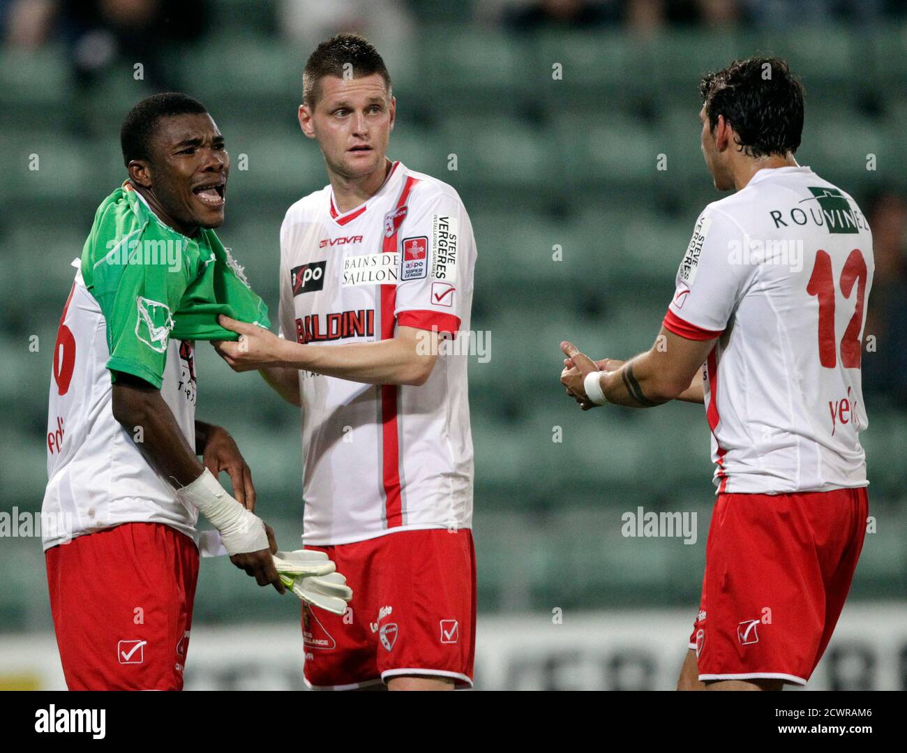 Fc Sion S Geoffroy Serey Die L Puts On The Goalkeeper S Jersey Next To Teammates Michael Dingsdag And Danick Yerly During Their Super League Soccer Match Against Fc Luzern In Sion May 23